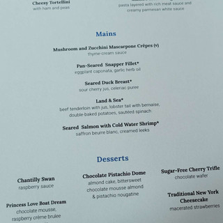 By this point it was almost time for dinner, formal night again. My wife and I looked quite dapper as she wore her new necklace with a matching dress (yes, that's how it works she informed me) and I donned my best suit. Dinner was great, surf and turf amongst the options so we both selected that. Escargot to start with, followed by shrimp and crab bisque, and the main course of tenderloin (rare) and a generous lobster tail. Pics below
